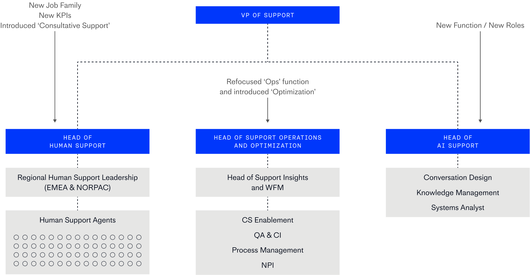 At Intercom, our Support team is now structured around three pillars: Human Support, AI Support, and Support Operations and Optimization.