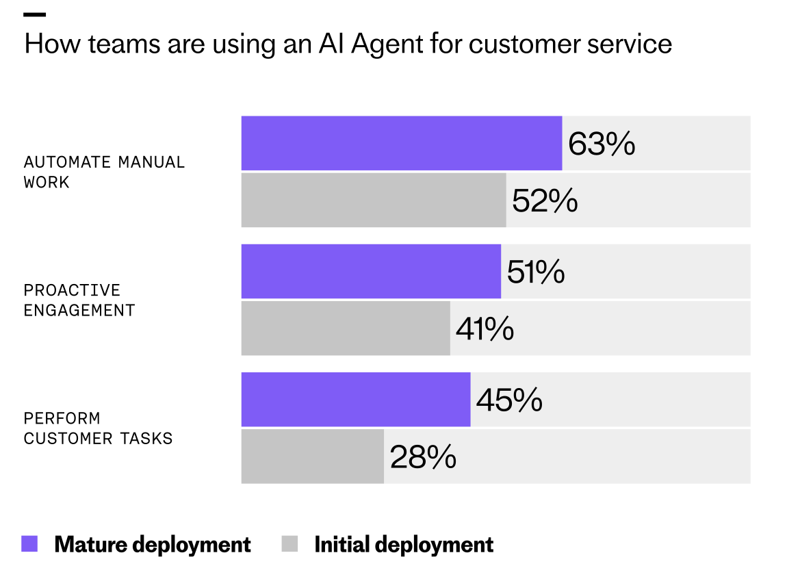 Teams that have reached mature deployment report a more sophisticated use of the technology. They’ve put AI at the core of their service operation, integrating it into critical workflows, giving it more responsibility, and continuously improving it.