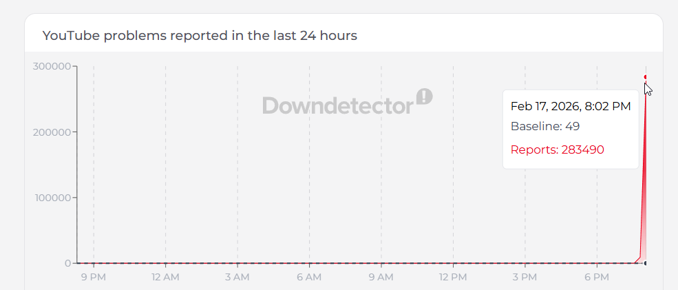 Starting at around 7:45pm ET (4:45pm PT) and expanding rapidly as of 8pm ET (5pm PT), YouTube is down in a fairly widespread outage. There are nearly 300,000 reports on DownDetector and growing, with a large spike for both Google and YouTube TV on the outage tracker as well – as far as we can tell, though, this is primarily a core YouTube outage.