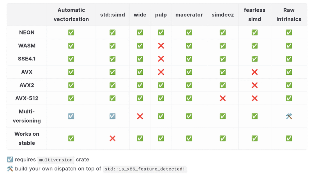 The wide crate is a mature, established option. It supports NEON, WASM and all the x86 instruction sets. But it doesn’t support multiversioning at all, save for very exotic and limited approaches like cargo-multivers.