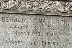 Benjamin Harrison (1833-1901) was the 23rd President of the United States (POTUS) and grandson of 9th POTUS William Henry Harrison. His tombstone says he was a “lawyer and publicist.” He was also a grizzled war veteran, ending up as Brigadier General of the US Army. He then became an Indiana state senator, then POTUS, being preceded and succeeded by Grover Cleveland. Feel free to look him up and see how busy and popular he was as president. While he was running for a second term in 1892, his dear wife Caroline died in the White House of tuberculosis. She was buried back home in Indiana at Crown Hill. Benjamin decided to be buried by her side nine years later, eschewing the grandeur of burial at Arlington National Cemetery.