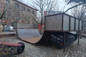 Bent Metal on Two Cars is a sculptural skate feature by Florentina Holzinger from 2024. At first glance, it looks like a fairly ordinary half-pipe. On closer inspection, however, two upside-down cars are visible beneath it, their wheels protruding up through the ramp.